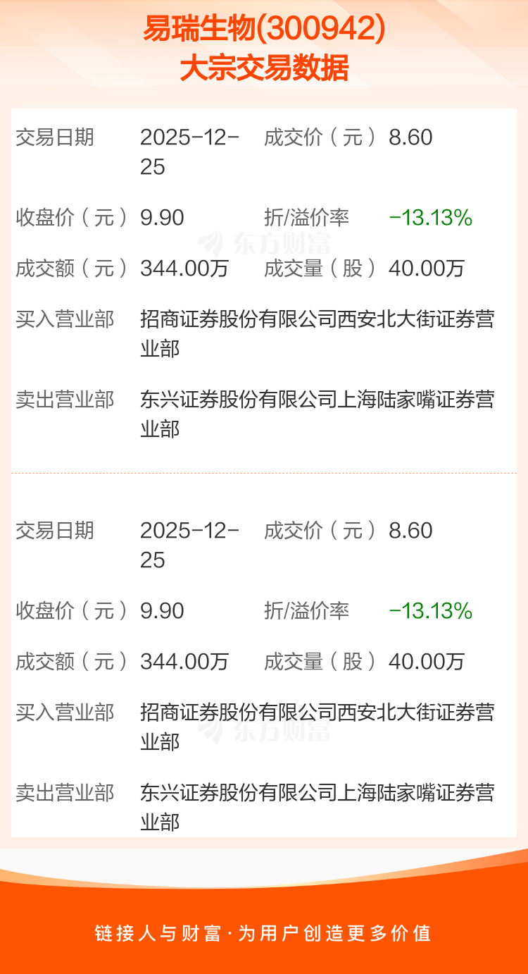 2025年12月25日,易瑞生物发生2笔大宗交易,共成交80.00万股,成交金额688.00万元,占其流通市值比例为0.17%。