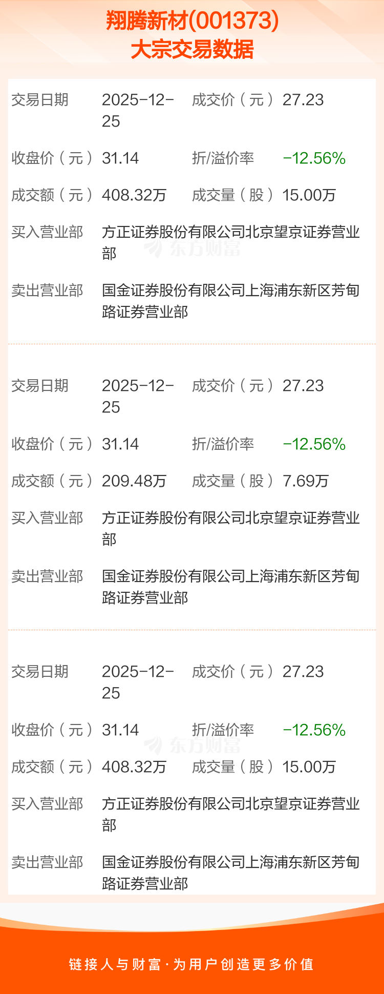 2025年12月25日,翔腾新材发生3笔大宗交易,共成交37.69万股,成交金额1026.12万元,占其流通市值比例为0.99%。