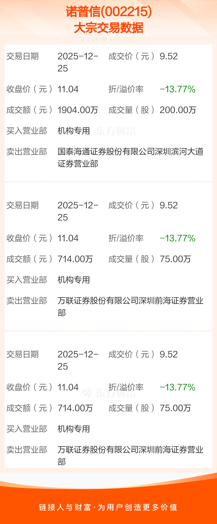 大宗交易:诺普信成交3332.00万元,折价13.77%(12-25)