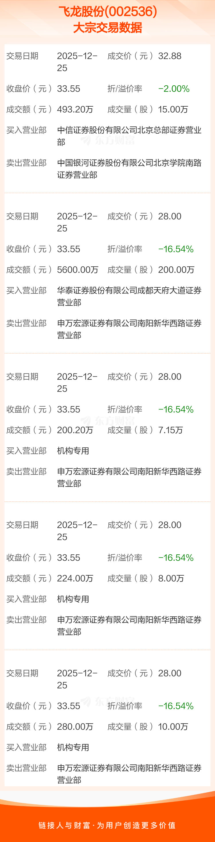 大宗交易:飞龙股份成交6797.40万元,折价15.63%(12-25)