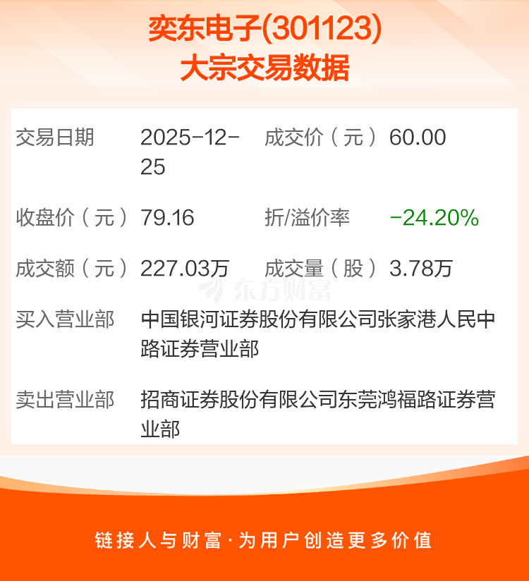 大宗交易:奕东电子成交227.03万元,折价24.20%(12-25)