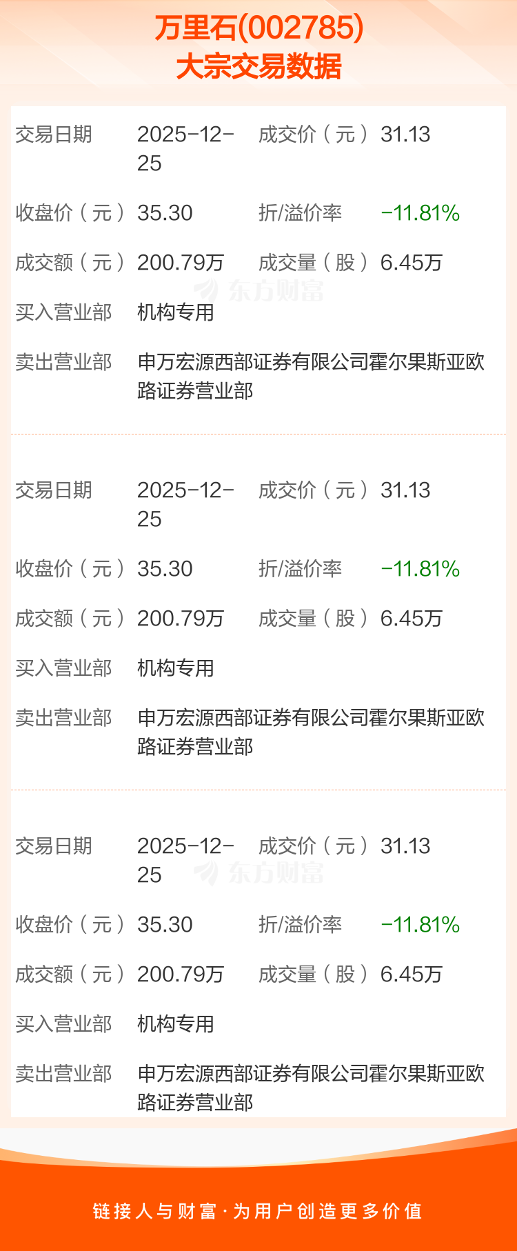 大宗交易:万里石成交602.37万元,折价11.81%(12-25)