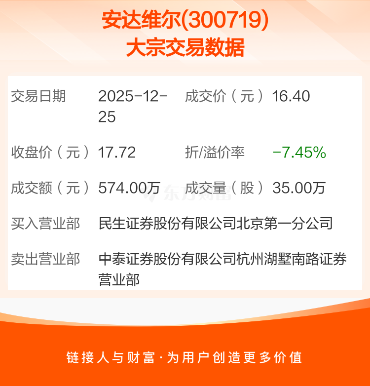 大宗交易:安达维尔成交574.00万元,折价7.45%(12-25)