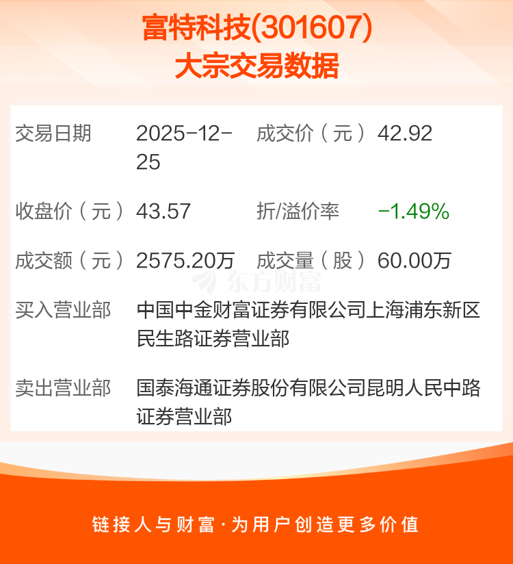 2025年12月25日,富特科技发生1笔大宗交易,共成交60.00万股,成交金额2575.20万元,占其流通市值比例为0.53%。