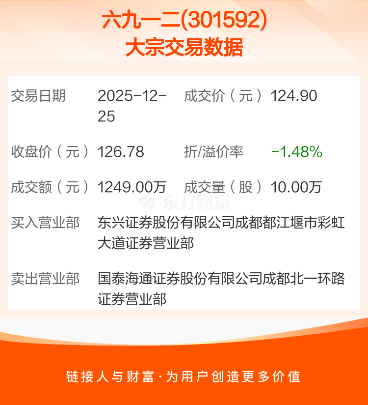 2025年12月25日,六九一二发生1笔大宗交易,共成交10.00万股,成交金额1249.00万元,占其流通市值比例为0.42%。