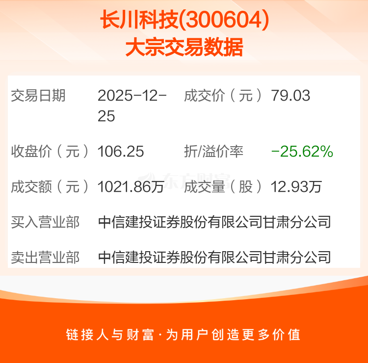 大宗交易:长川科技成交1021.86万元,折价25.62%(12-25)