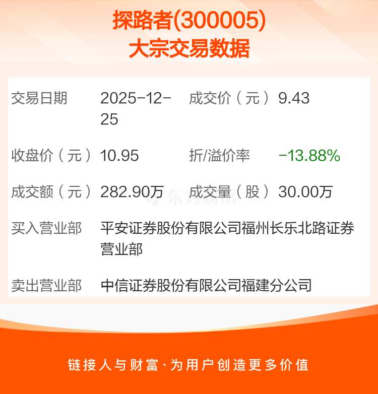 2025年12月25日,探路者发生1笔大宗交易,共成交30.00万股,成交金额282.90万元,占其流通市值比例为0.03%。