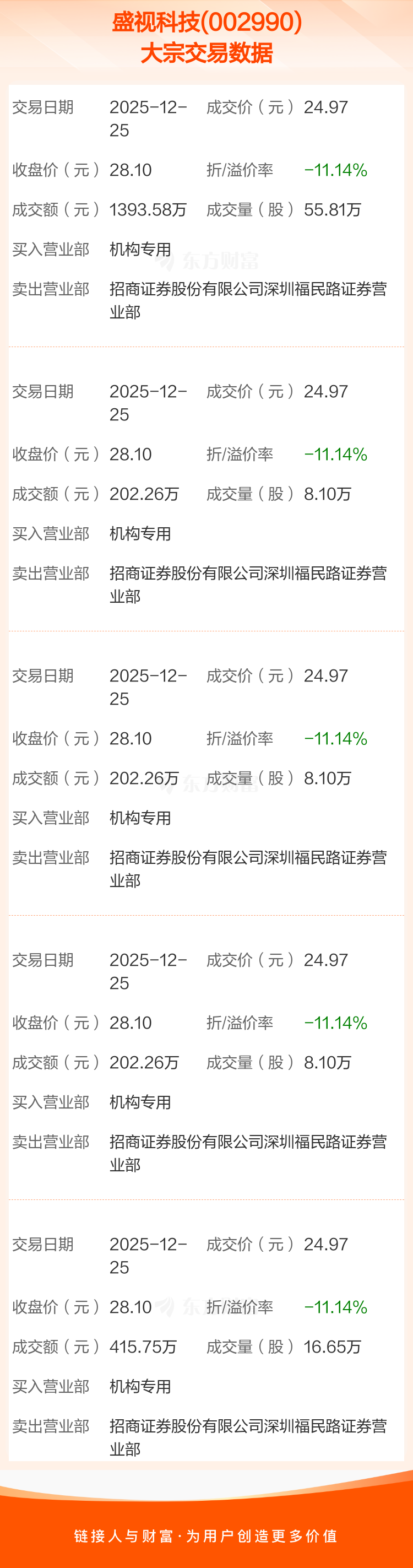 2025年12月25日,盛视科技发生5笔大宗交易,共成交96.76万股,成交金额2416.11万元,占其流通市值比例为0.64%。