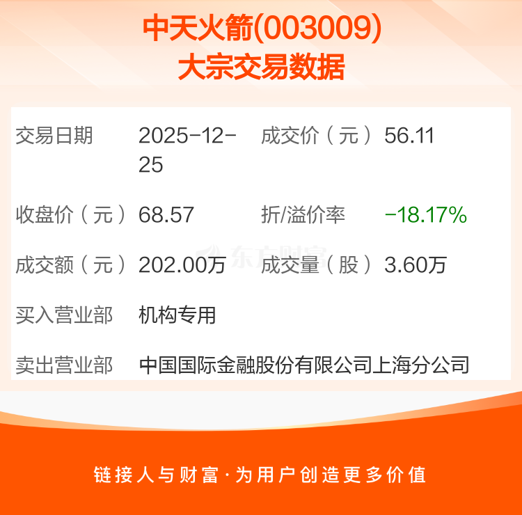 2025年12月25日,中天火箭发生1笔大宗交易,共成交3.60万股,成交金额202.00万元,占其流通市值比例为0.02%。