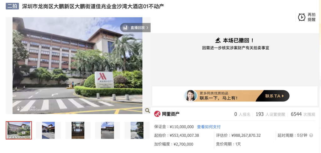 12月25日,阿里资产司法平台显示,原定于当日启动二次拍卖的“深圳市龙岗区大鹏新区大鹏街道佳兆业金沙湾大酒店01不动产”显示“本场已撤回”,平台公示撤回理由为“需进一步核实涉案财产有关拍卖事宜”。