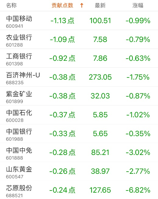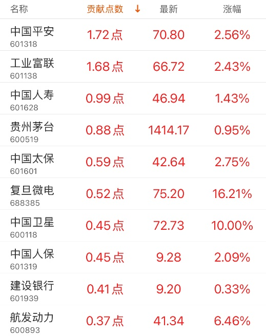 对上证指数贡献点数最多的个股是中国平安,贡献1.72点,该股当日涨2.56%,收盘价70.8元;拖累点数最多的个股是中国移动,拖累1.13点,该股当日跌0.99%,收盘价100.51元。