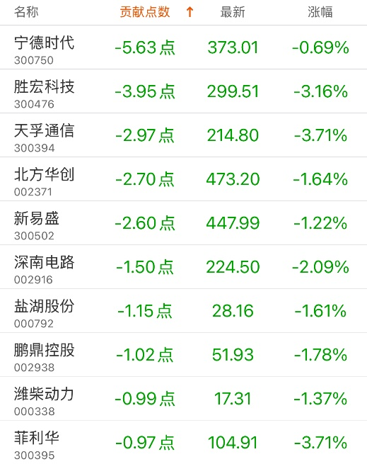 对深证成指贡献点数最多的个股是三花智控,贡献5.28点,该股当日涨5.50%,收盘价47.56元;拖累点数最多的个股是宁德时代,拖累5.63点,该股当日跌0.69%,收盘价373.01元。