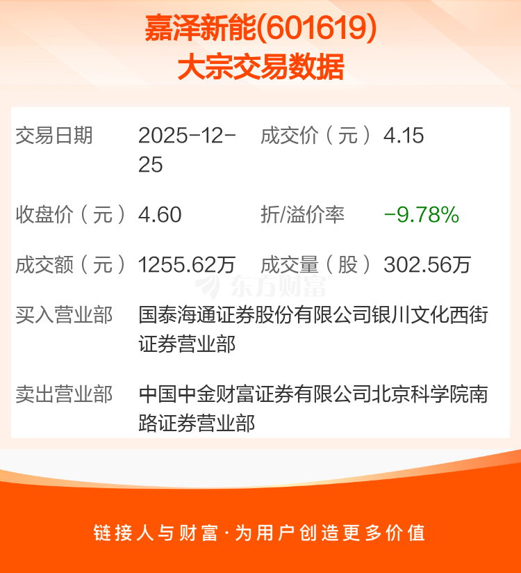 大宗交易:嘉泽新能成交1255.62万元,折价9.78%(12-25)