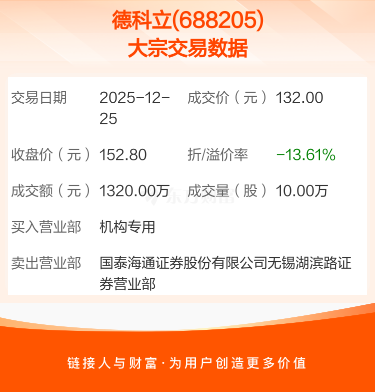 2025年12月25日,德科立发生1笔大宗交易,共成交10.00万股,成交金额1320.00万元,占其流通市值比例为0.05%。