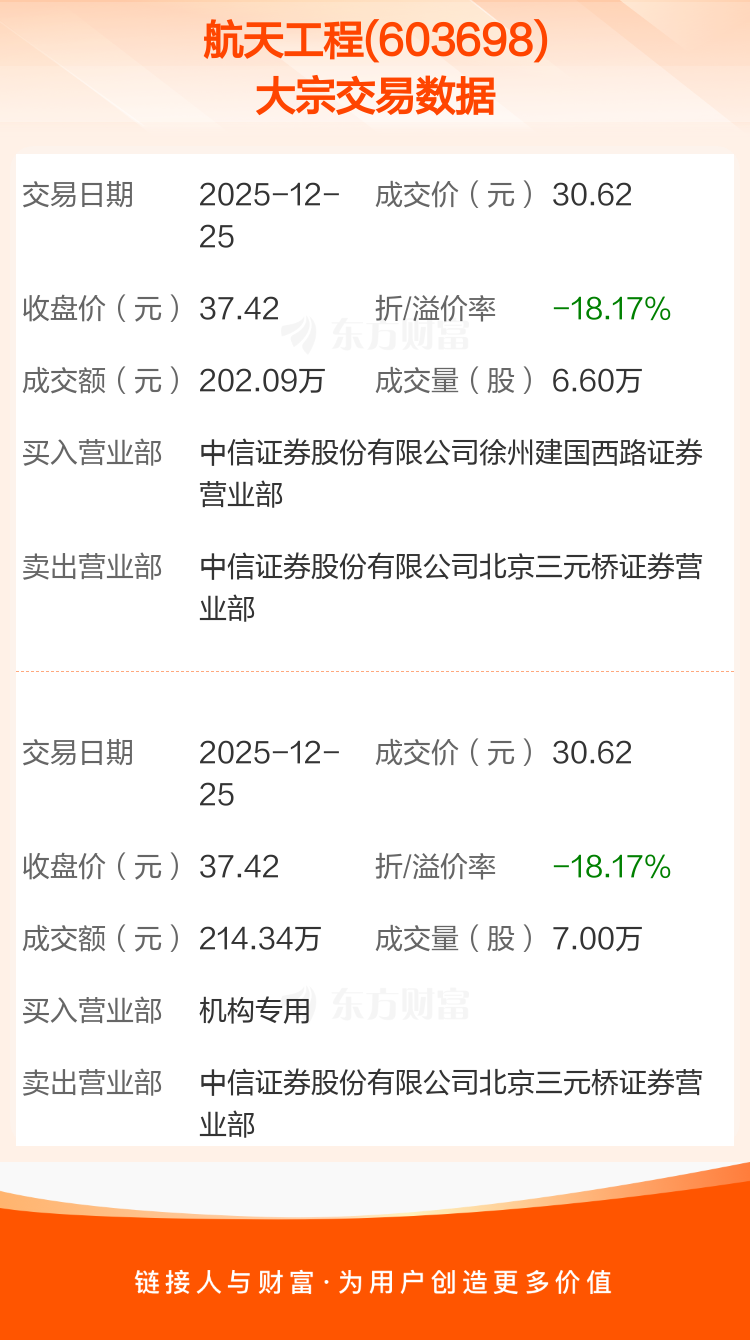 2025年12月25日,航天工程发生2笔大宗交易,共成交13.60万股,成交金额416.43万元,占其流通市值比例为0.02%。
