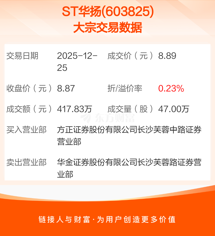 2025年12月25日,ST华扬发生1笔大宗交易,共成交47.00万股,成交金额417.83万元,占其流通市值比例为0.19%。