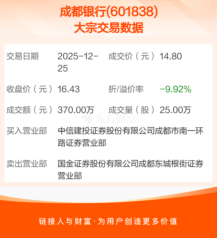 大宗交易:成都银行成交370.00万元,折价9.92%(12-25)