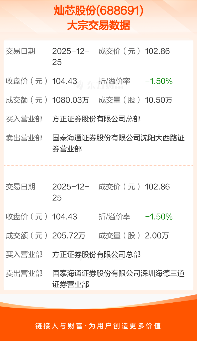 2025年12月25日,灿芯股份发生2笔大宗交易,共成交12.50万股,成交金额1285.75万元,占其流通市值比例为0.17%。