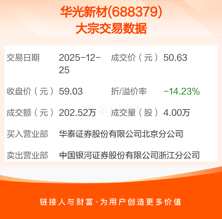 2025年12月25日,华光新材发生1笔大宗交易,共成交4.00万股,成交金额202.52万元,占其流通市值比例为0.04%。