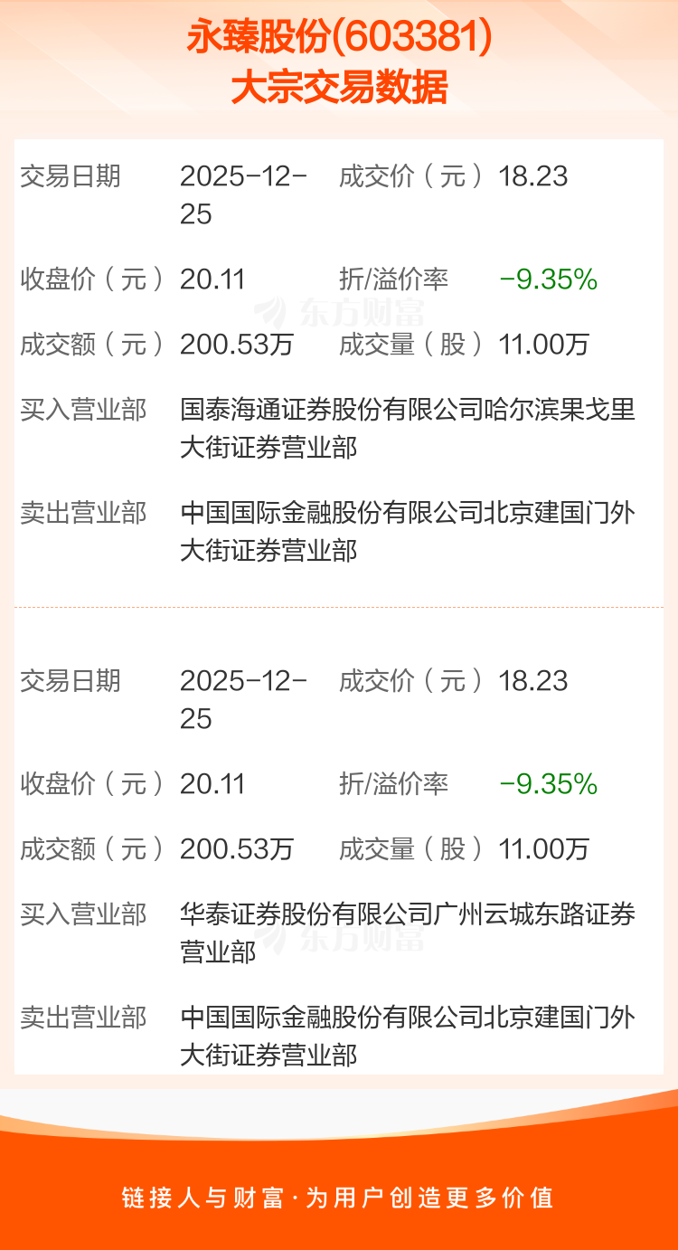 2025年12月25日,永臻股份发生2笔大宗交易,共成交22.00万股,成交金额401.06万元,占其流通市值比例为0.14%。