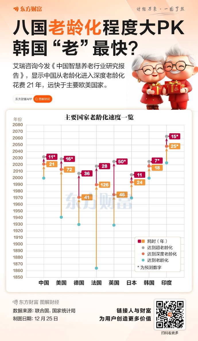 艾瑞咨询今日(12月25日)发布《中国智慧养老行业研究报告》,其援引的联合国相关数据显示,中国从老龄化进入深度老龄化花费21年,远快于主要欧美国家。根据联合国标准,65岁及以上人口占比达7%为老龄化社会,14%为深度老龄化,20%以上为超老龄化。官方数据显示,截至2024年末,中国65周岁及以上老年人口占总人口15.6%,绝对数量达到2.2亿人。