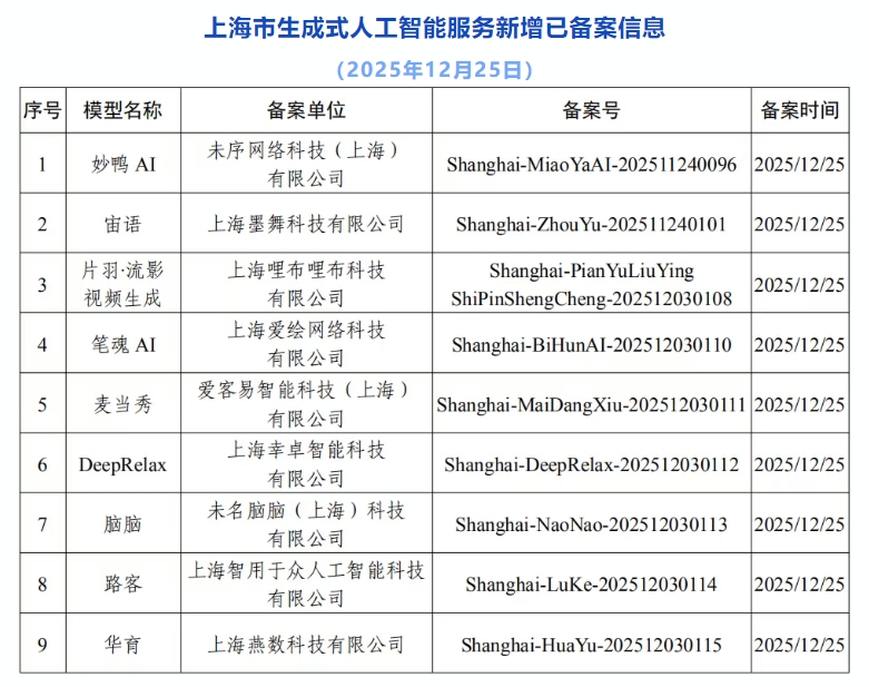 据“网信上海”,截至12月25日,上海市新增9款已完成备案的生成式人工智能服务,累计已完成137款生成式人工智能服务备案。
