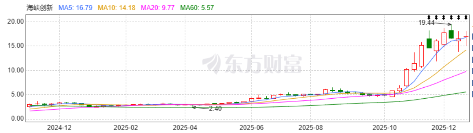 二级市场上,海峡创新股票在2025年10月27日至11月17日期间累计涨幅达185.89%。近两个月,公司多次发布股票交易异动公告,表示公司目前经营情况正常,不存在关于公司的应披露而未披露的重大事项。截至25日收盘,公司股价报16.99元/股,公司总市值113.3亿元。