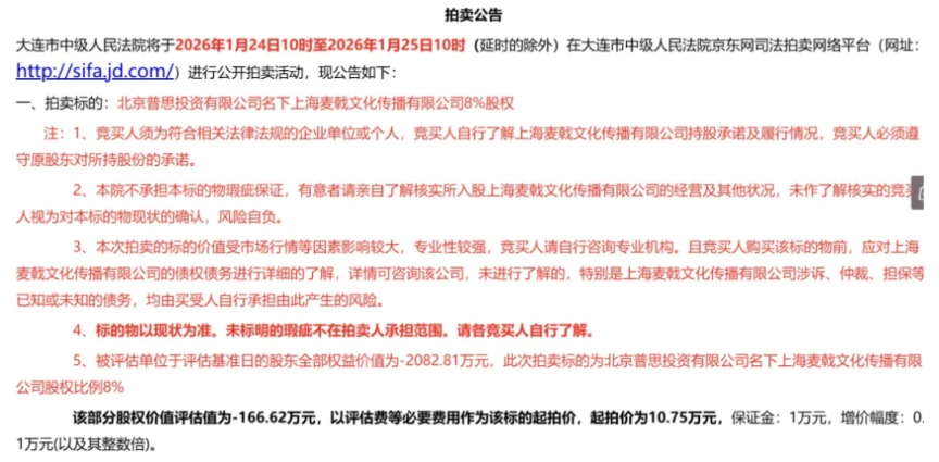天眼查显示,近日,大连市中级人民法院发布拍卖公告,将于2026年1月24日10时至2026年1月25日10时(延时的除外)在大连市中级人民法院京东网司法拍卖网络平台进行拍卖活动,拍卖标的为北京普思投资有限公司名下麦戟文化传播有限公司8%股权。
