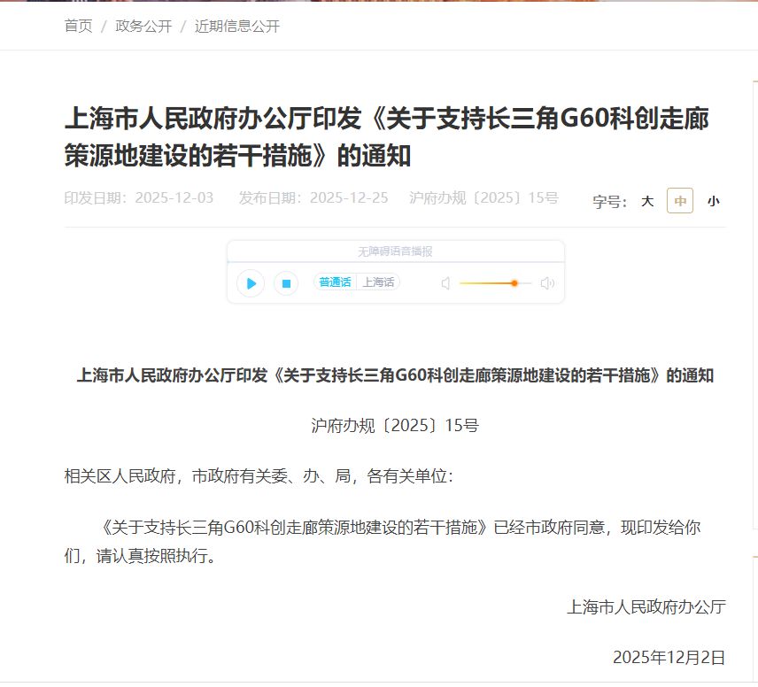 据上海市政府网消息,12月25日,上海市政府办公厅印发的《关于支持长三角G60科创走廊策源地建设的若干措施》(以下简称《若干措施》)上网公开。