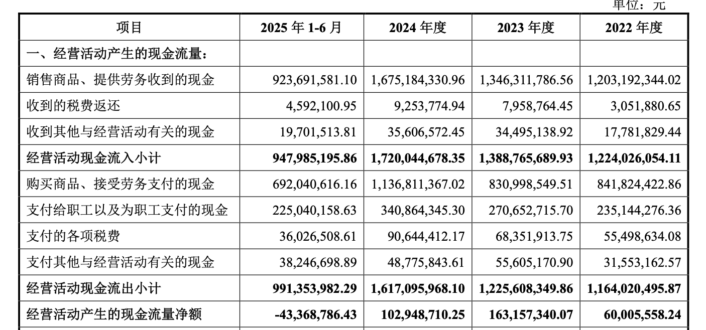深交所注意到,维通利在报告期内虽然净利润高增,但经营性现金流却表现不佳。报告期内,公司归母净利润分别为1.14亿元、1.87亿元、2.71亿元和1.39亿元,但经营活动现金流却分别为6001万元、1.63亿元、1.03亿元和-4337万元,与净利润的增长趋势明显不符。