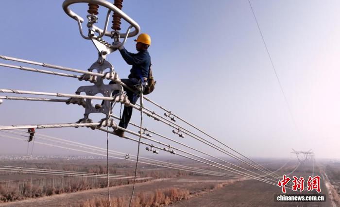 今年11月20日,电力员工在库车—阿拉尔—巴楚750千伏输变电工程开展走线验收。马元摄