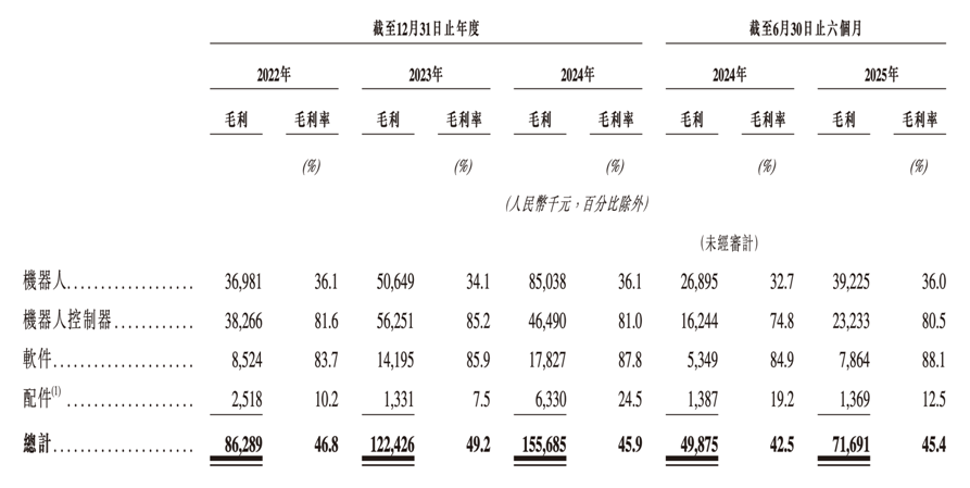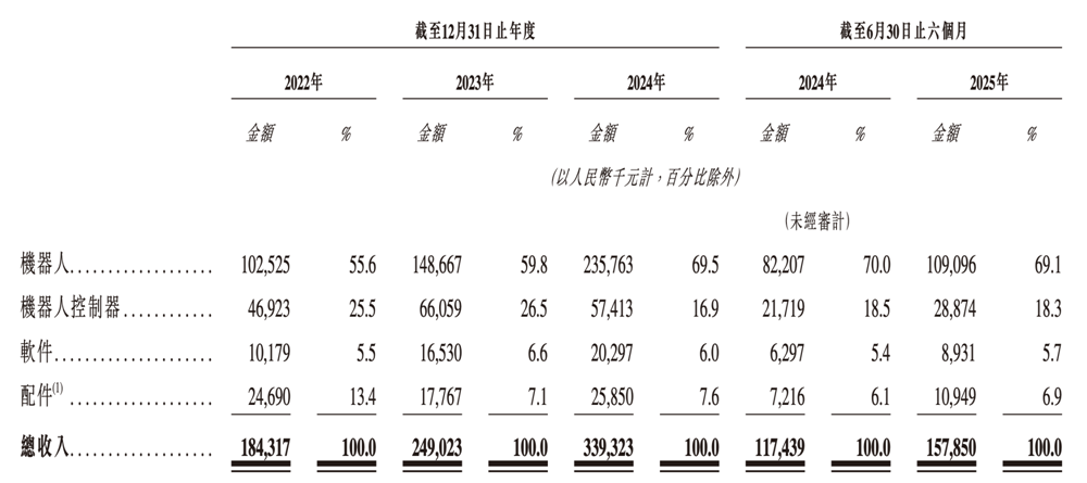公司核心产品平均单价出现下降。机器人单价从2022年的13.56万元降至2025年6月末的8.62万元。公司在招股书中表示:“我们的机器人及机器人控制器平均单价持续下降,主要由于上游零部件成本下降以及规模经济效益日益显现,使我们能够在维持稳定毛利率的同时,优化供应链及生产成本并调整定价。”