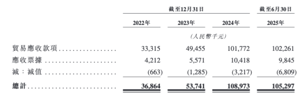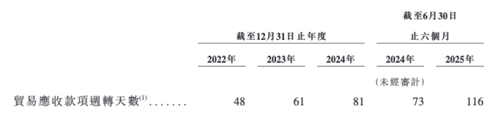 截至2025年6月末,公司现金及等价物仅1.62亿元,而累计亏损已超1.7亿元,若IPO募资不及预期,现金流恐难支撑公司运营。这一困境源于三重财务压力的叠加。首先是资金回笼效率的急剧恶化。贸易应收款项从2022年的3686万元激增至2024年的1.09亿元,周转天数从48天延长至81天,又增至2025年上半年的116天;2025年上半年末应收款余额达1.05亿元,占同期营收的66.5%,相当于近七成收入尚未兑现。
