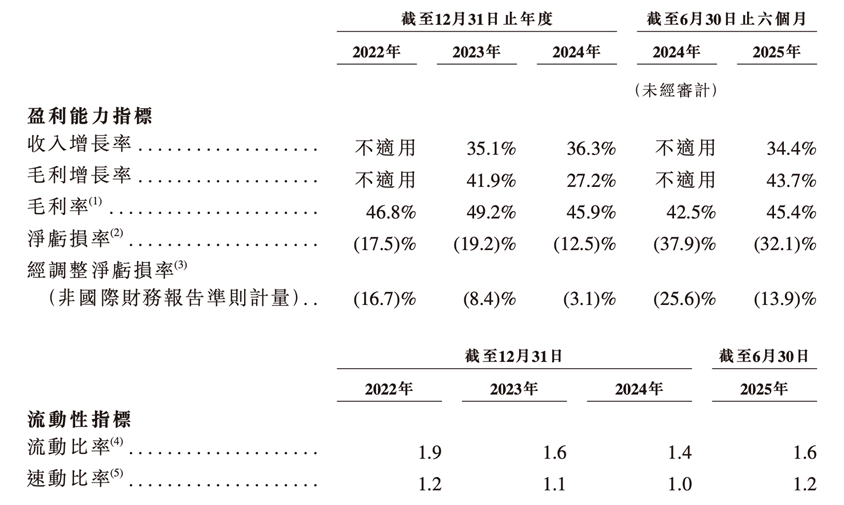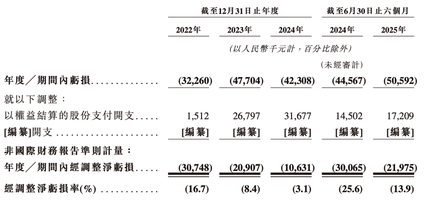 对应的净亏损率由2024年的12.5%飙升至2025年上半年32.1%;经调整净亏损率从2024年的3.1%飙升至13.9%,盈利能力显著恶化。