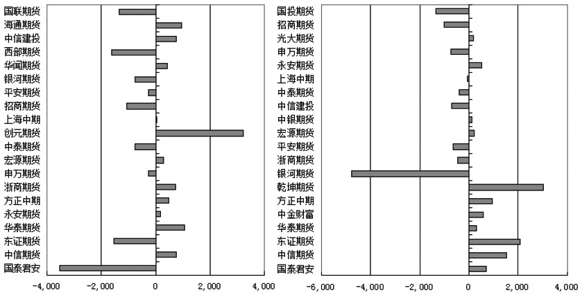 空头前20席位中,增持空单的有11家。增持空单数量超过1000手的有3家,分别为中信期货席位、东证期货席位和乾坤期货席位,分别大幅增加1535手、2077手和3028手。另外,增持空单数量介于100手至1000手的有8家,分别为国泰君安期货席位、华泰期货席位、中金财富期货席位、方正中期席位、宏源期货席位、中银期货席位、永安期货席位和光大期货席位,分别增加716手、320手、585手、957手、216手、112手、522手和197手。