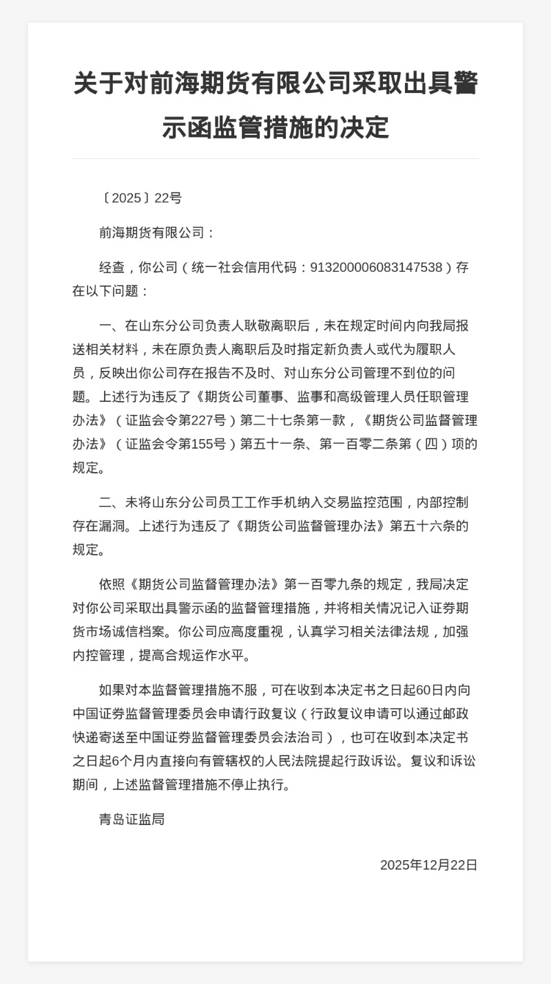 蓝鲸新闻12月25日讯,近日,青岛证监局发布行政监管措施决定书,剑指前海期货有限公司。