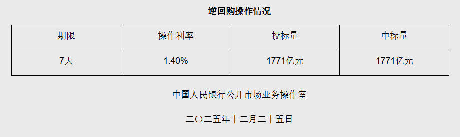 中新网12月25日电据央行网站消息,2025年12月25日中国人民银行以固定利率、数量招标方式开展了1771亿元7天期逆回购操作。具体情况如下: