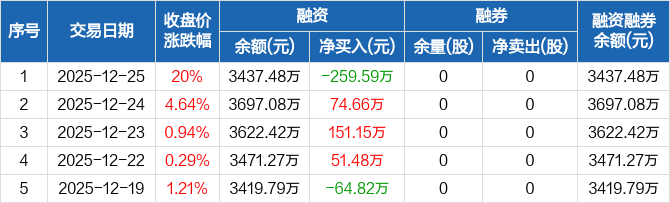 恒达新材:融资净偿还259.59万元,融资余额3437.48万元(12-25)