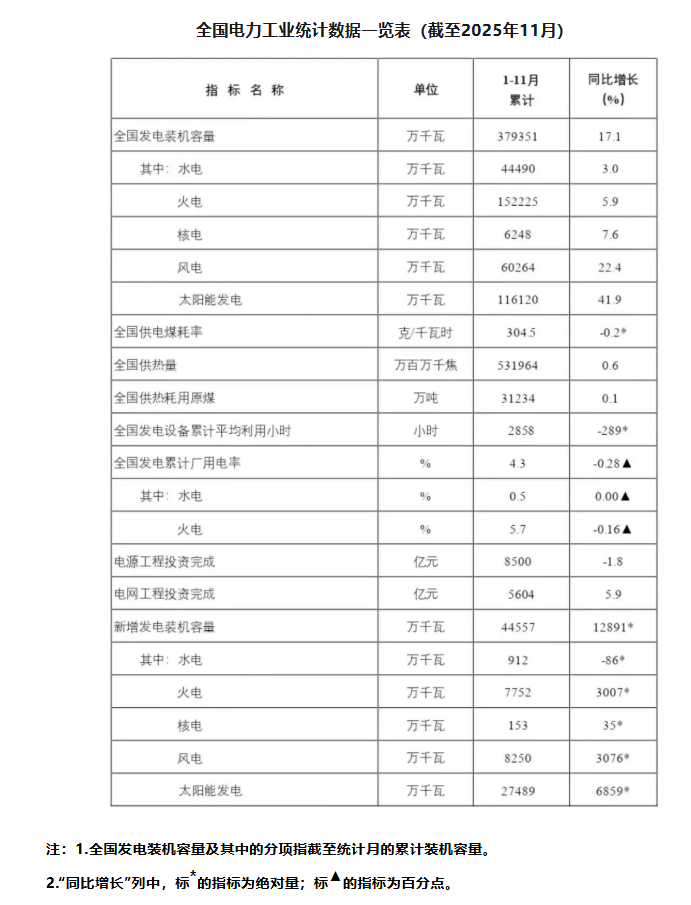 国家能源局发布1-11月份全国电力工业统计数据。截至11月底,全国累计发电装机容量37.9亿千瓦,同比增长17.1%。其中,太阳能发电装机容量11.6亿千瓦,同比增长41.9%;风电装机容量6.0亿千瓦,同比增长22.4%。1-11月份,全国发电设备累计平均利用2858小时,比上年同期降低289小时。