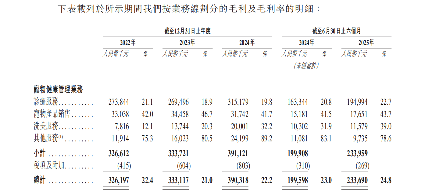 瑞派宠物的宠物医院毛利率长期维持在较低水平。2022年-2024年以及2025年上半年,公司毛利率分别为22.4%、21%、22.2%及24.8%,主要由于为公司贡献了超九成的诊疗服务毛利率较低,2025年上半年毛利率较高的宠物产品(43.7%)及洗护美容服务(39%)占比较低。