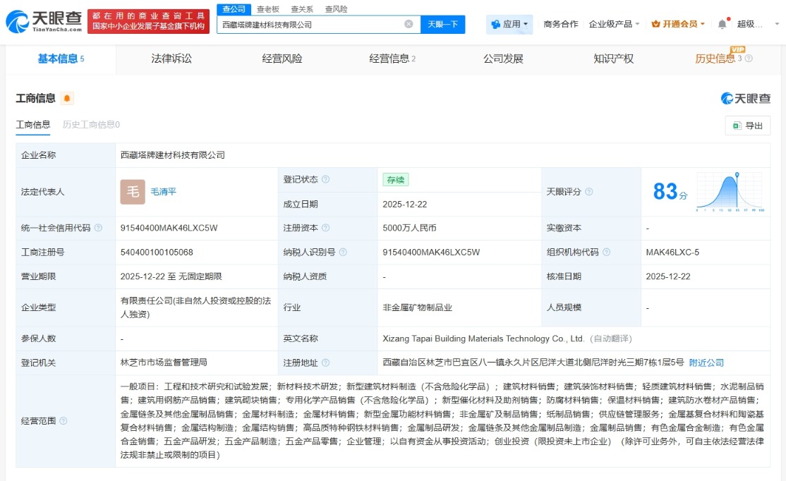 南方财经12月26日电,天眼查App显示,近日,西藏塔牌建材科技有限公司成立,法定代表人为毛清平,注册资本5000万人民币,经营范围包括工程和技术研究和试验发展、新材料技术研发、新型建筑材料制造、新型金属功能材料销售等。股东信息显示,该公司由塔牌集团全资持股。
