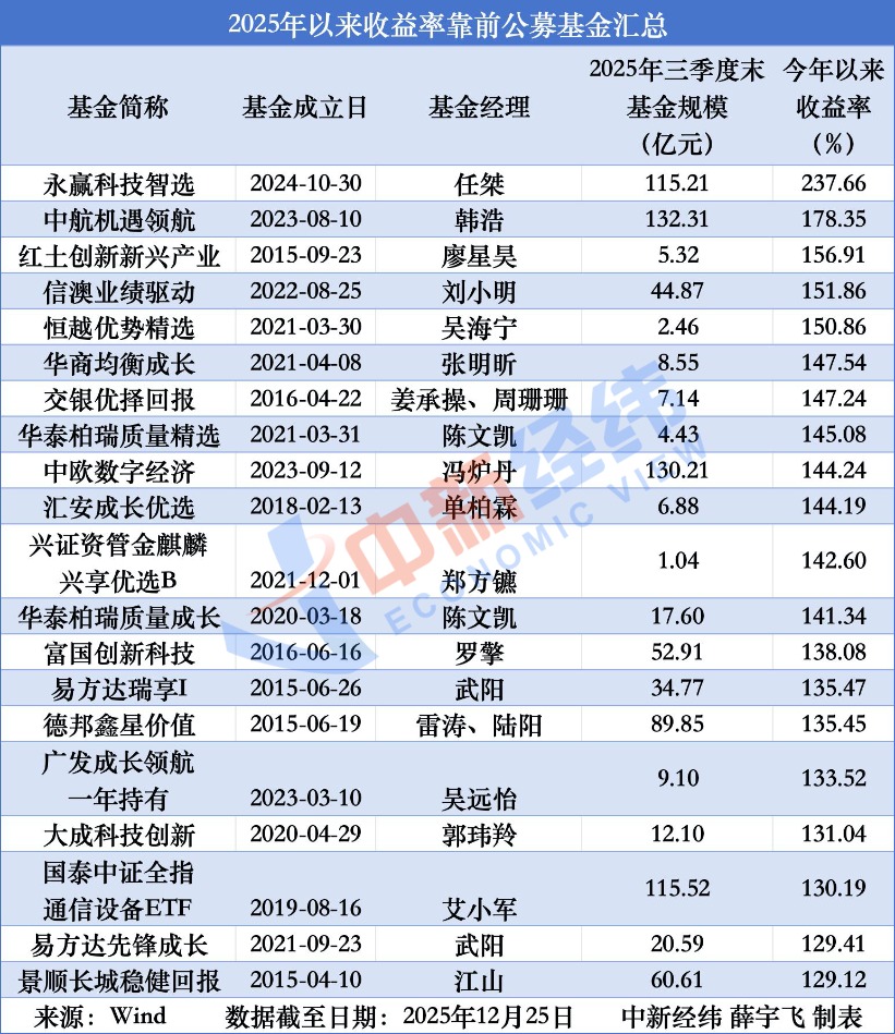 中新经纬12月26日电 (薛宇飞)2025年即将结束,公募基金收益排位赛进入到最后4个交易日的冲刺期。目前,永赢科技智选是唯一一只年内收益率超过200%的公募基金,基本提前锁定了冠军的位置。