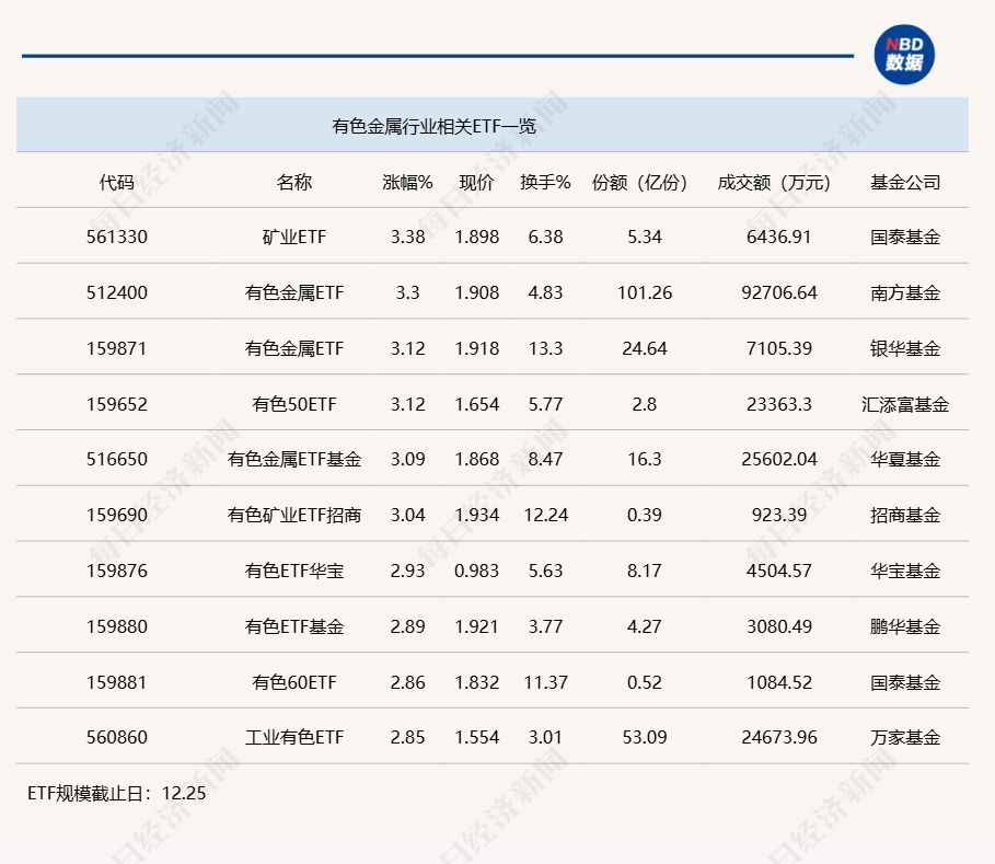 ETF涨幅榜方面,有色金属行业反弹明显,6只有色相关ETF半日涨幅超过3%。