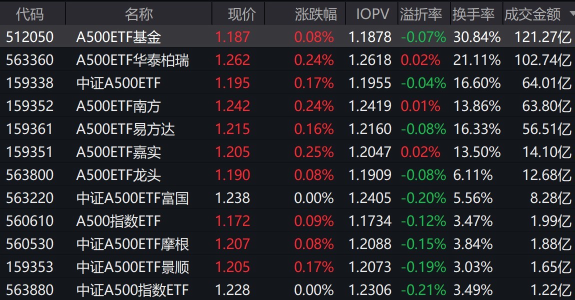 截至上午收盘,多只场内跟踪中证A500指数的ETF小幅上涨。其中,有12只中证A500相关ETF成交额超1亿元,2只超百亿元。A500ETF基金、A500ETF华泰柏瑞早盘成交额分别为121.27亿元、102.74亿元。