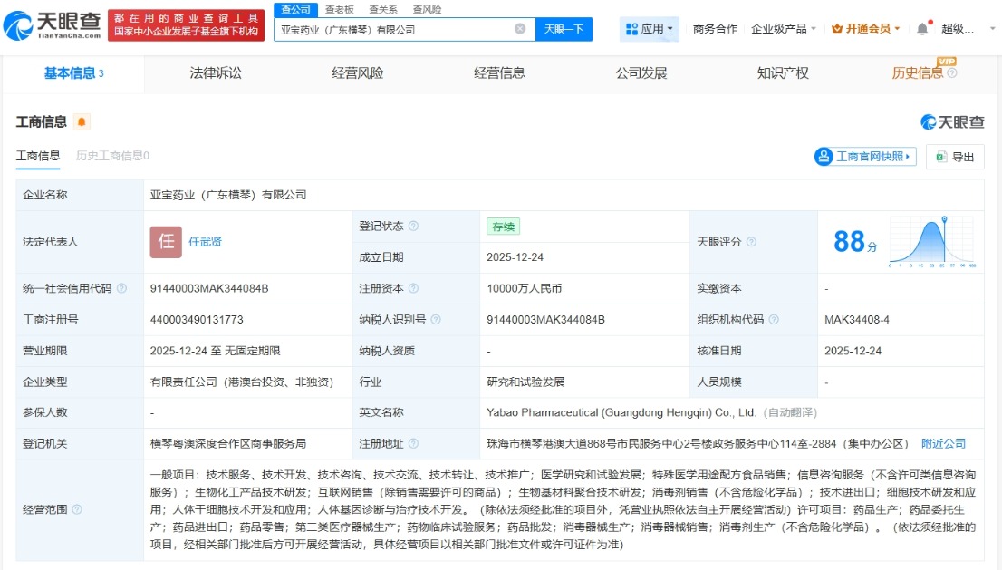 南方财经12月26日电,天眼查App显示,近日,亚宝药业(广东横琴)有限公司成立,法定代表人为任武贤,注册资本1亿人民币,经营范围包括医学研究和试验发展、生物化工产品技术研发、生物基材料聚合技术研发等。股东信息显示,该公司由亚宝药业(600351)、亚宝药业(澳门)有限公司共同持股。