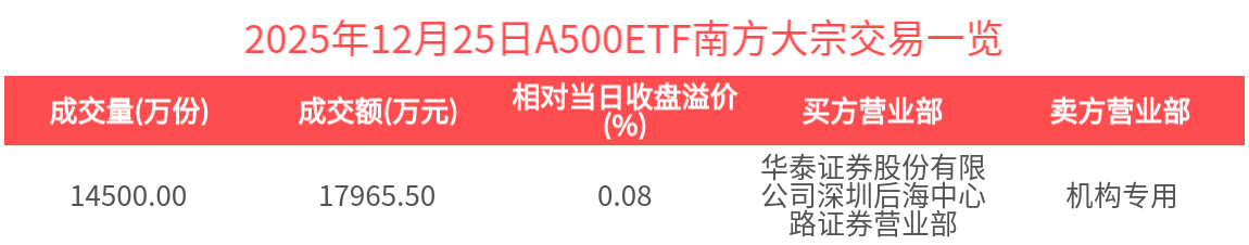ETF大宗榜 | A500ETF南方(159352):获大宗交易溢价买入1.80亿元,居全市场前二-20251225