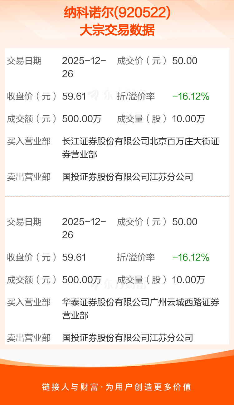 2025年12月26日,纳科诺尔发生2笔大宗交易,共成交20.00万股,成交金额1000.00万元,占其流通市值比例为0.13%。