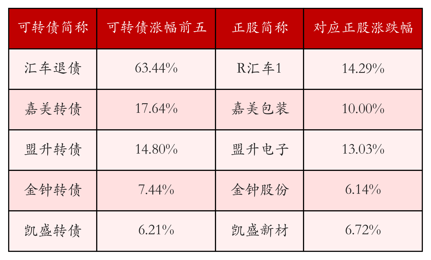 南财智讯12月26日电,南财金融终端盘后数据显示,债市方面,中证转债指数收跌0.04%,报493.25,成交额为928.25亿元。可转债方面,今日共成交381只可转债,其中123只收涨,0只收平,258只收跌。具体来看,16只可转债涨幅超过2%。其中汇车退债(404004)涨63.44%,嘉美转债(127042)涨17.64%,盟升转债(118045)涨14.8%。今日有25只可转债跌幅超2%,松霖转债(113651)跌5.24%,华医转债(123251)跌4.85%,汇成转债(118049)跌4.02%。存在交易量的可转债所对应的正股中,128只收涨,14只收平,239只收跌。具体来看,13只可转债对应正股涨幅超过5%,其中,R汇车1(400245)涨停,收涨14.29%。同时所对应的可转债:汇车退债(404004)同涨63.44%。今日有1只可转债对应正股跌幅超过5%,没有正股跌停。