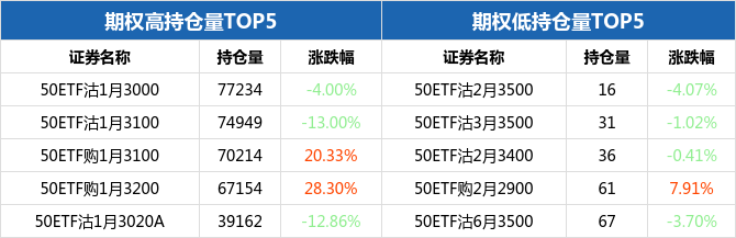 从持仓量来看,50ETF期权合约中,50ETF沽1月3000持仓量最大,为77234张,期权全日下跌4.00%,报收0.0096元;持仓量最小的为50ETF沽2月3500,共计16张,期权全日下跌4.07%,报收0.377元。