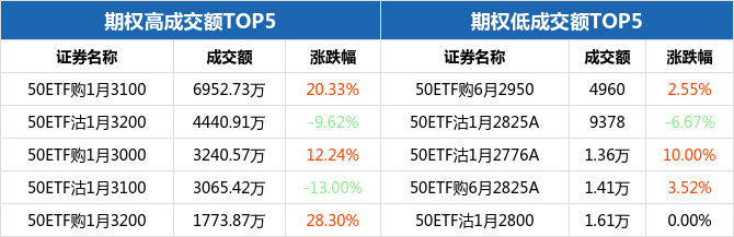 从成交额来看,50ETF期权合约中,50ETF购1月3100成交额最高,为6952.73万元,全日上涨20.33%,报收0.0586元;而最低的为50ETF购6月2950,成交额为4960元,全日上涨2.55%,报收0.241元。